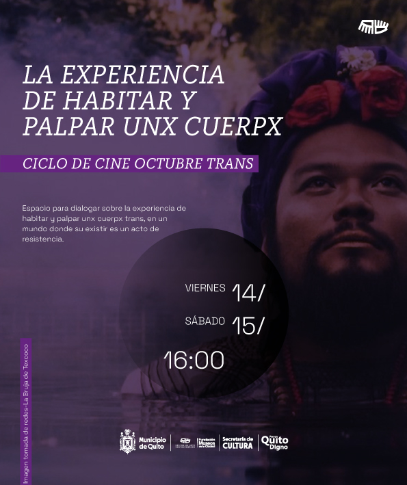 El Centro de Arte Contemporáneo (CAC) invita al espacio de encuentro ‘La experiencia de palpar y habitar unx cuerpx’ que se llevará a cabo los días viernes 14 y sábado 15 de octubre de 2022 a partir de las 16:00 de cada jornada mencionada. Este ciclo de cine se desarrolla en el marco del reconocimiento de octubre como el mes para visibilizar la lucha trans en el Ecuador.
